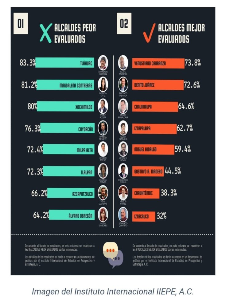 Con el fin de evaluar los servicios públicos y atención ciudadana el Instituto Internacional IIEPE, A.C. como parte de su sección de Opinión Pública, se ha dado a la tarea de realizar diversos estudios de opinión en redes sociales para evaluar a los 16 alcaldes de la Ciudad de México, entidad que experimenta por primera vez en su historia esta figura de gobierno.