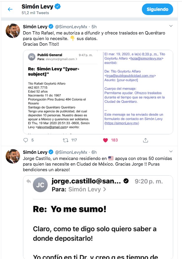 En su cuenta de twitter https://twitter.com/SimonLevyMx el galardonado economista, emprendedor y autor Simón Levy solicita a personas físicas y morales que puedan apoyar con viajes para emergencias y comidas a domicilio. Puede brindarse el servicio voluntario personal, de compañías de transporte o pagar viajes mediante apps de transporte. Se puede ofrecer este voluntariado al correo hola@simonlevy.mx