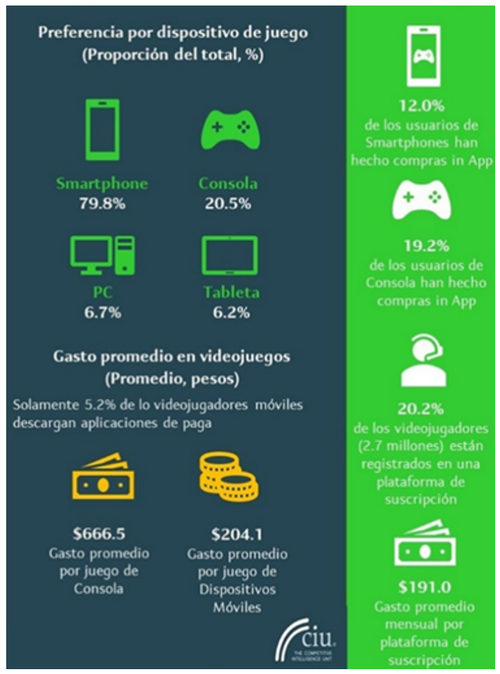 | El mercado de videojuegos en México alcanzó una generación de ingresos de $16,928.0 millones de pesos durante el primer semestre de 2022, 5.5% más con respecto al mismo periodo de 2021.Esta industria se ha transformado de forma radical en los últimos 20 años, con nuevas formas de jugar y modelos de negocio que han habilitado la entrada de segmentos de población cada vez más variados.Al segundo trimestre de 2022 (2T-2022), 79.8% son jugadores principalmente casuales que juegan a través de su smartphone, mientras que 20.5% lo hace desde consolas fijas, 6.7% mediante computadoras y sólo 6.2% vía tabletas.20.2% de los jugadores están inscritos en algún servicio de paga mensual para jugar un catálogo de juegos de forma ilimitada, con un gasto promedio de $191.0 pesos al mes.9.9% del total de la base de jugadores (6.5 millones de personas) declaran que han competido en un torneo de videojuegos. A su vez, 23.1% de los gamers, o 15.2 millones, ven canales especializados de videojugadores. |