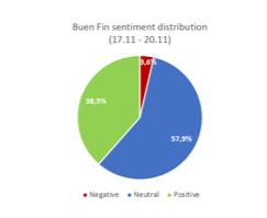 En relación con el sentimiento frente a las campañas del Buen Fin, el promedio de menciones positivas se ubicó en 38.5%, alcanzando el 42% el 17 de noviembre, mientras que las menciones negativas tuvieron un promedio de 3.6%.