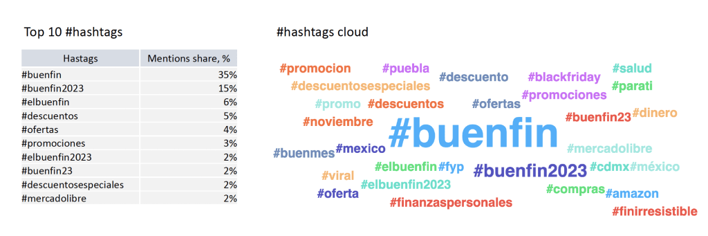 El hashtag con mayor frecuencia de uso fue #buenfin, seguido por #buenfin2023 (15%) y #elbuenfin (6%).