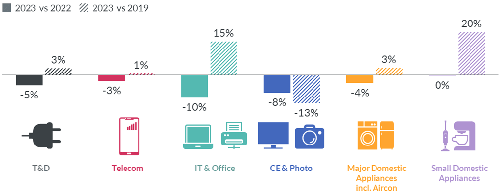 Aunque los ingresos interanuales para 2023 parecen bastante sombríos, siguen estando por encima del nivel prepandémico de 2019. Esto se debe principalmente a los sectores de TI y Pequeños Electrodomésticos (PAE), que se situaron muy por encima de los ingresos de 2019, con más del 16% y más del 21%, respectivamente. Por otro lado, la Electrónica de Consumo (EC) se mantuvo débil.