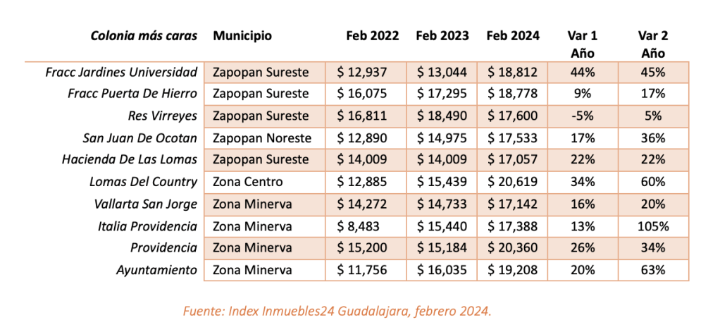 De acuerdo con los datos de la plataforma, dos de las colonias más caras en sus precios son Providencia (en Zona Minerva) con una renta mensual de $20,360 pesos, y Lomas del Country (Zona Centro) con un costo de $20,619 pesos. En estas colonias la variación de precios en los últimos dos años fue de 34% y 60%, respectivamente.