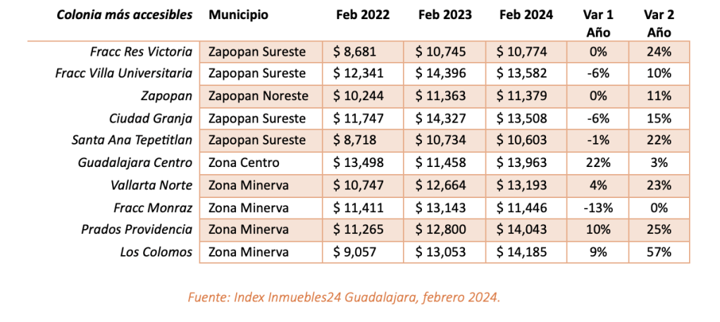 Por su parte, algunas de las colonias más económicas para rentar en Guadalajara presentan precios que fluctúan entre los poco más de $10,000 pesos y menos de $15,000 pesos mensuales. De acuerdo con los anuncios registrados en la plataforma, la colonia más accesible es Santa Ana Tepetitlán con un precio promedio de $10,603 pesos.