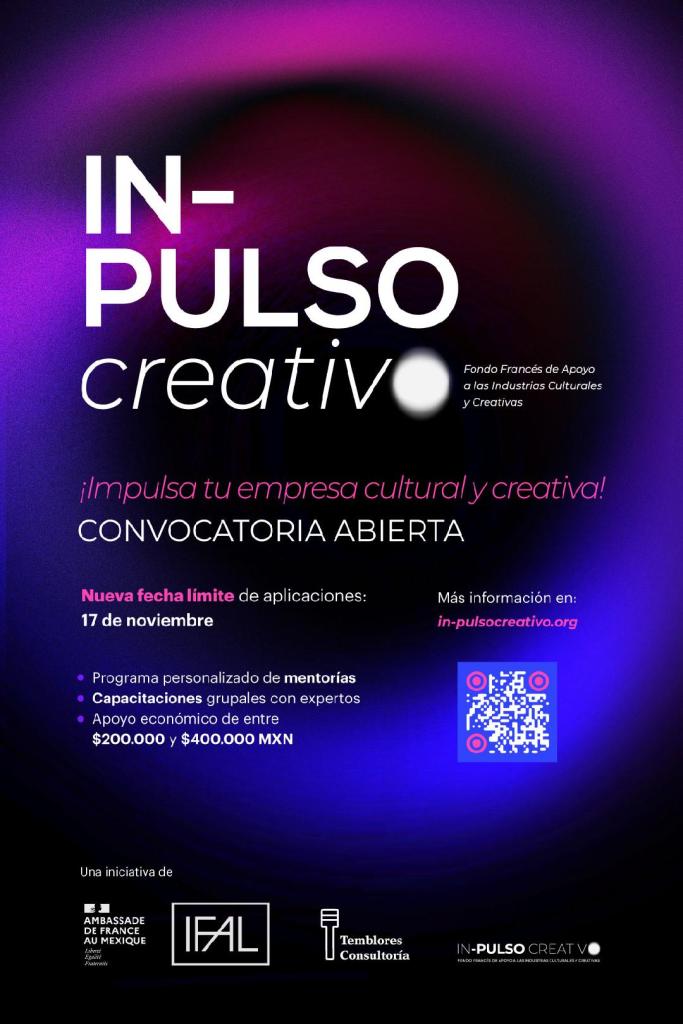 Te comparto el enlace web de la convocatoria en donde encontrarán los requisitos para participar, así como el formulario que habrá que completar:https://in-pulsocreativo.org/ y a través de sus redes sociales encontrarán más detalles que están por anunciarse: https://www.instagram.com/in_pulsocreativo/ Además en el siguiente link encontrarán el portal de preguntas frecuentes: https://in-pulsocreativo.org/preguntas-frecuentes/