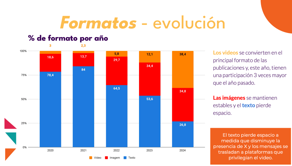 ● El formato video representa el 38.4% de las publicaciones en 2024, destacándose en plataformas como Instagram, donde los reels generan más engagement.