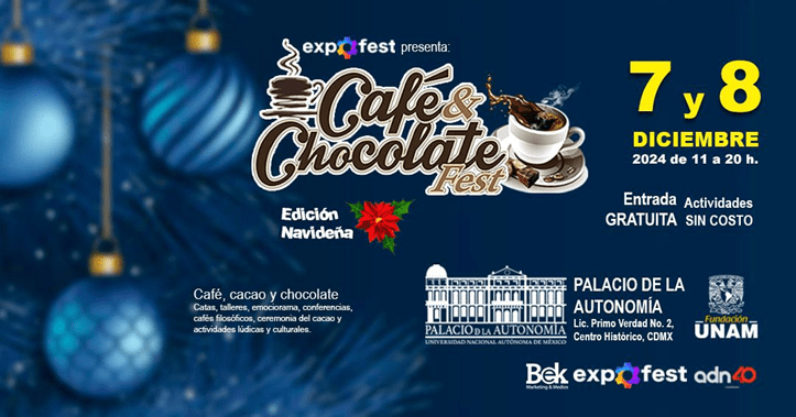 Prepárate con todo lo que necesites para recibir la Navidad en el CAFÉ Y CHOCOLATE FEST, todo un festín para el paladar y para todos tus sentidos, que se llevará a cabo el sábado 7 y domingo 8 de Diciembre, en el Palacio de la Autonomía de la Fundación UNAM, ubicado en Lic. Primo de Verdad No. 2 casi esquina con Moneda, en el Centro Histórico de la Ciudad de México.