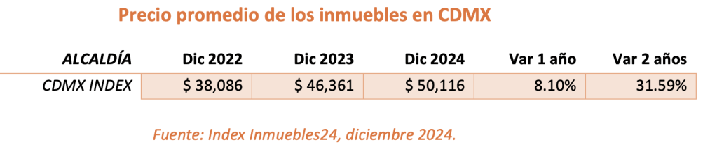 Ciudad de México, enero de 2025.- De acuerdo con un análisis realizado en base a los avisos publicados por anunciantes en el portal inmobiliario Inmuebles24, en los últimos dos años, el precio promedio de los inmuebles en la capital ha presentado una variación al alza de 31.5%. Cabe señalar que, los inmuebles a los que hace referencia el Index son unidades de 65m2 con dos habitaciones y un lugar de estacionamiento.
