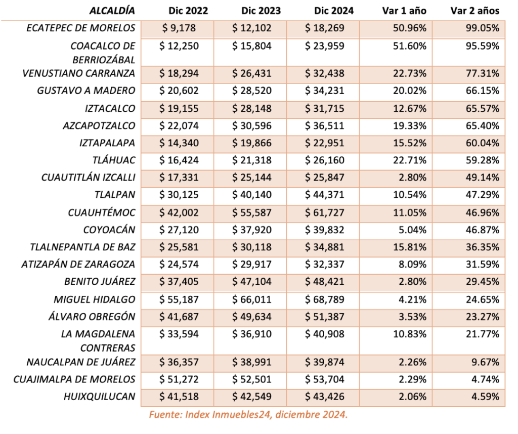 Por otra parte, las alcaldías Gustavo A. Madero, Iztapalapa, Iztacalco, Tláhuac y Azcapotzalco presentaron alzas de más del 60% en sus precios de venta por m2 en los últimos dos años; mientras que Tlalpan, Cuauhtémoc y Coyoacán tuvieron alzas de poco más del 40%.