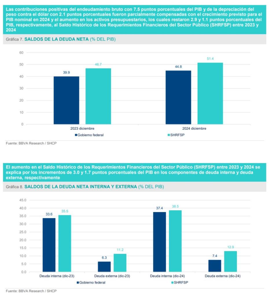 - El aumento en el SHRFSP entre 2023 y 2024 se explica por los incrementos de 3.0 y 1.7 puntos porcentuales del PIB en los componentes de deuda interna y deuda externa, respectivamente