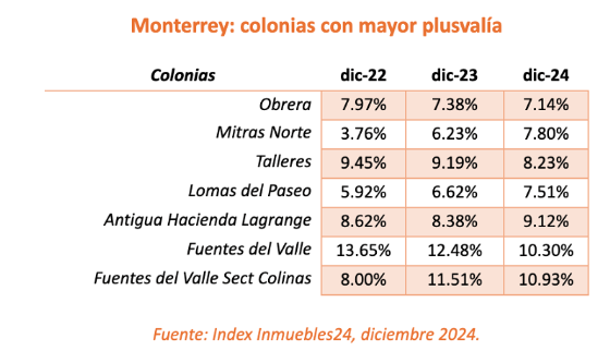 Las dos colonias con mayor plusvalía son la Fuentes del Valle Sector Colinas, que en los dos últimos años tuvo un porcentaje mayor al 10%; y la Fuentes del Valle, que para diciembre de 2024 registraba una plusvalía de 10.30%.