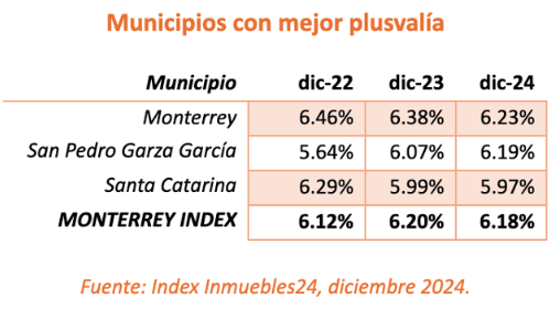 Cabe señalar que la plusvalía promedio de la capital neoleonesa, Monterrey, es de 6.18% y registra una leve variación en comparación con un año anterior, cuando fue de 6.20%.
