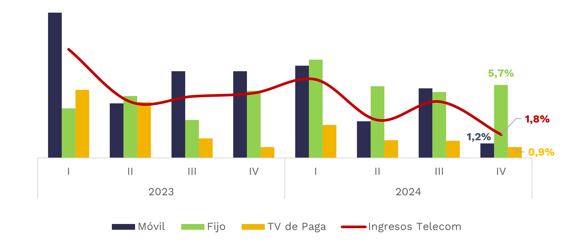 | Ingresos de Telecomunicaciones en México, Totales y por Segmento (Crecimiento Anual, %) |