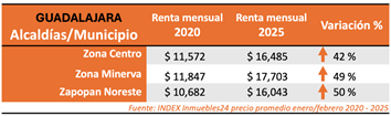 Por su parte, en Guadalajara las zonas de mayores aumentos de precios fueron Zapopan Noreste, Zona Minerva y Zona Centro, en las cuáles la variación porcentual al alza no pasó de 50%.