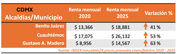 En CDMX las alcaldías con mayores aumentos de precios de renta mensual fueron Gustavo A. Madero, Cuauhtémoc y Benito Juárez con variaciones promedio a la alza de 63, 53 y 41%, respectivamente.