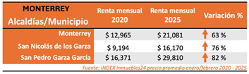 Por otra parte, en Monterrey los tres municipios con mayor aumento de precios de alquiler fueron San Pedro Garza García, San Nicolás de los Garza y Monterrey con 82, 76 y 63%, respectivamente.