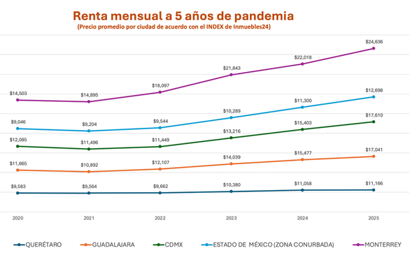 Destaca que la ciudad que mayores aumentos tuvo en la renta promedio durante el periodo señalado fue Monterrey al pasar de $14,503 pesos a $24,636 pesos, y la localidad con el menor incremento fue Querétaro, que pasó de $9,583 pesos a $11,166 pesos. En un punto intermedio se sitúa la CDMX.