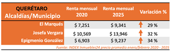En cuanto a las alcaldías/municipios que registraron mayores aumentos en los precios de renta en cada una de estas ciudades, en Querétaro se situaron: Epigmenio González, Josefa Vergara y el Marqués con 34%, 32% y 29% al alza.