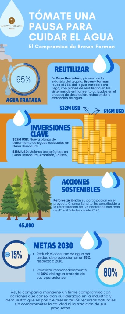 Conscientes de que la sustentabilidad trasciende sus propias operaciones, Brown-Forman también participa en iniciativas ambientales que impactan positivamente a las comunidades donde opera. En el proyecto Charco Bendito, ha contribuido a la reforestación de 125 hectáreas con más de 45,000 árboles desde 2020, ayudando a mejorar la calidad del agua y restaurar ecosistemas.