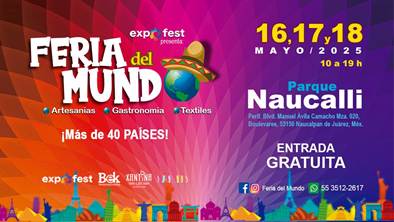 La FERIA DEL MUNDO se ha realizado con gran éxito en distintas sedes de la Ciudad de México y por primera vez se llevará a cabo los días 16, 17 Y 18 DE MAYO, de 10 a 19 horas, en uno de los parques más importantes de la Zona Metropolitana del Valle de México, el PARQUE ESTADO DE MÉXICO NAUCALLI ubicado en Periférico Blvd. Manuel Ávila Camacho Manzana 020, Col. Boulevares, 53150 Naucalpan de Juárez, Méx., a un costado de las Torres de Satélite y con accesos también por Blvd. de la Santa Cruz y Av. Lomas Verdes.