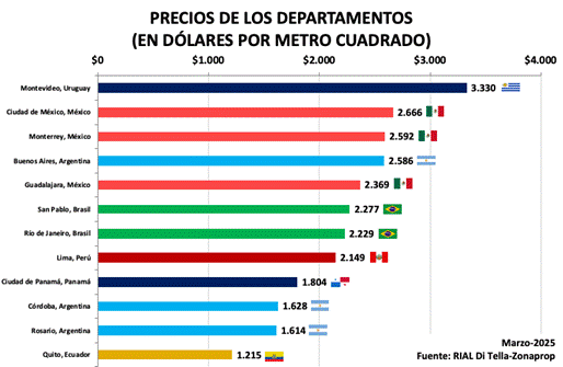 Ciudad de México, 06 de mayo de 2025. El Centro de Investigación en Finanzas (CIF) de la Escuela de Negocios de la Universidad Torcuato Di Tella en conjunto con Inmuebles24 presentan los resultados del Relevamiento Inmobiliario de América Latina (RIAL Di Tella – Inmuebles24) de marzo de 2025. Las ciudades con el metro cuadrado (m2) más caro de la región son Montevideo (3,330 dólares), Ciudad de México (2,666 dólares), Monterrey (2,592 dólares) y Buenos Aires (2,586 dólares). Por el contrario, las ciudades con el m2 más económico son Quito (1,215 dólares), Rosario (1,614 dólares), Córdoba (1,628 dólares) y Panamá (1,804 dólares).