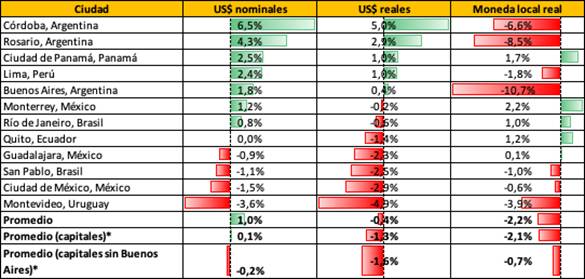 Medido en dólares nominales, las ciudades en las que hubo un mayor aumento porcentual del precio fueron Córdoba (6.5%) y Rosario (4.3%) y Ciudad de Panamá (2.5%). Por su parte, las mayores caídas se dieron en Montevideo (-3.6%), Ciudad de México (-1.5%) y San Pablo (-1.1%) en el último semestre. Valuado en moneda local real, las ciudades con mayores incrementos fueron Monterrey (2.2%) y Ciudad de Panamá (1.7%).