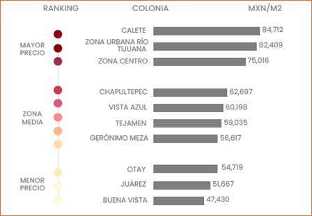 Las colonias con precios más elevados son: Calete, Zona Urbana Río Tijuana y la Zona Centro. En estas colonias los precios por metro cuadrado fluctúan entre los $75,000 y los $84,712 pesos.