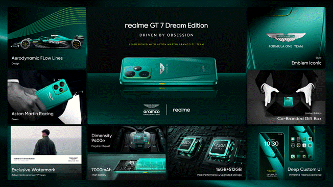 El realme GT 7 Dream Edition, desarrollado en colaboración con Aston Martin Formula One™ Team, es el primer smartphone co-branded con AMF1. Presenta el icónico color verde de carreras de Aston Martin, un diseño aerodinámico de dos alas, y un emblema grabado con alas plateadas, encarnando el espíritu de la velocidad y el lujo. La caja exclusiva de colección incluye una funda Silver Wing y un pin de tarjeta SIM en forma de coche F1, aumentando su atractivo.