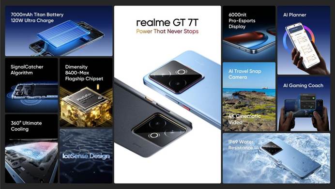 El protagonista del evento fue el realme GT 7, presentado como el «Flagship Killer del 2025». Equipado con una batería titán de 7000 mAh y carga ultra rápida de 120W, permite un uso durante todo el día, con solo 14 minutos para alcanzar el 50% de carga y 40 minutos para una carga completa. La tecnología Smart Bypass reduce el calor y prolonga la vida útil de la batería. Esta potente combinación también ha obtenido la primera certificación de batería de 5 estrellas TÜV Rheinland en la industria.