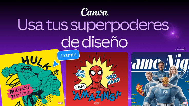 La colección Marvel en Canva está disponible en todo el mundo para uso personal, con plantillas digitales en inglés, coreano, indonesio, francés, alemán, portugués y español. Estas plantillas se suman a la colección Disney en Canva, que incluye a personajes icónicos de Star Wars™, a Mickey Mouse, Moana, Elsa y más.