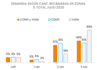 De acuerdo con los datos del reporte, las viviendas de 3 recámaras son las más demandadas en Valle: representan el 69% del total de las búsquedas. Por su parte, en CDMX las unidades de 2 recámaras son las más demandadas (41% del total de búsquedas). En tanto que, las unidades más pequeñas (hasta 1 recámara) alcanzan una demanda de 17% del total de búsquedas en CDMX.