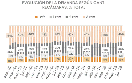 El reporte de la plataforma indica que las unidades de 3 recámaras perdieron cuota de mercado: en 2022 representaban el 54% del total de búsquedas, y actualmente representan el 45% del total. Por otro lado, creció la demanda de las unidades más chicas: las búsquedas de unidades de hasta 1 recámara representan el 18% del total. Las búsquedas de unidades de 2 recámaras se mantienen estables en torno al 36% del total.