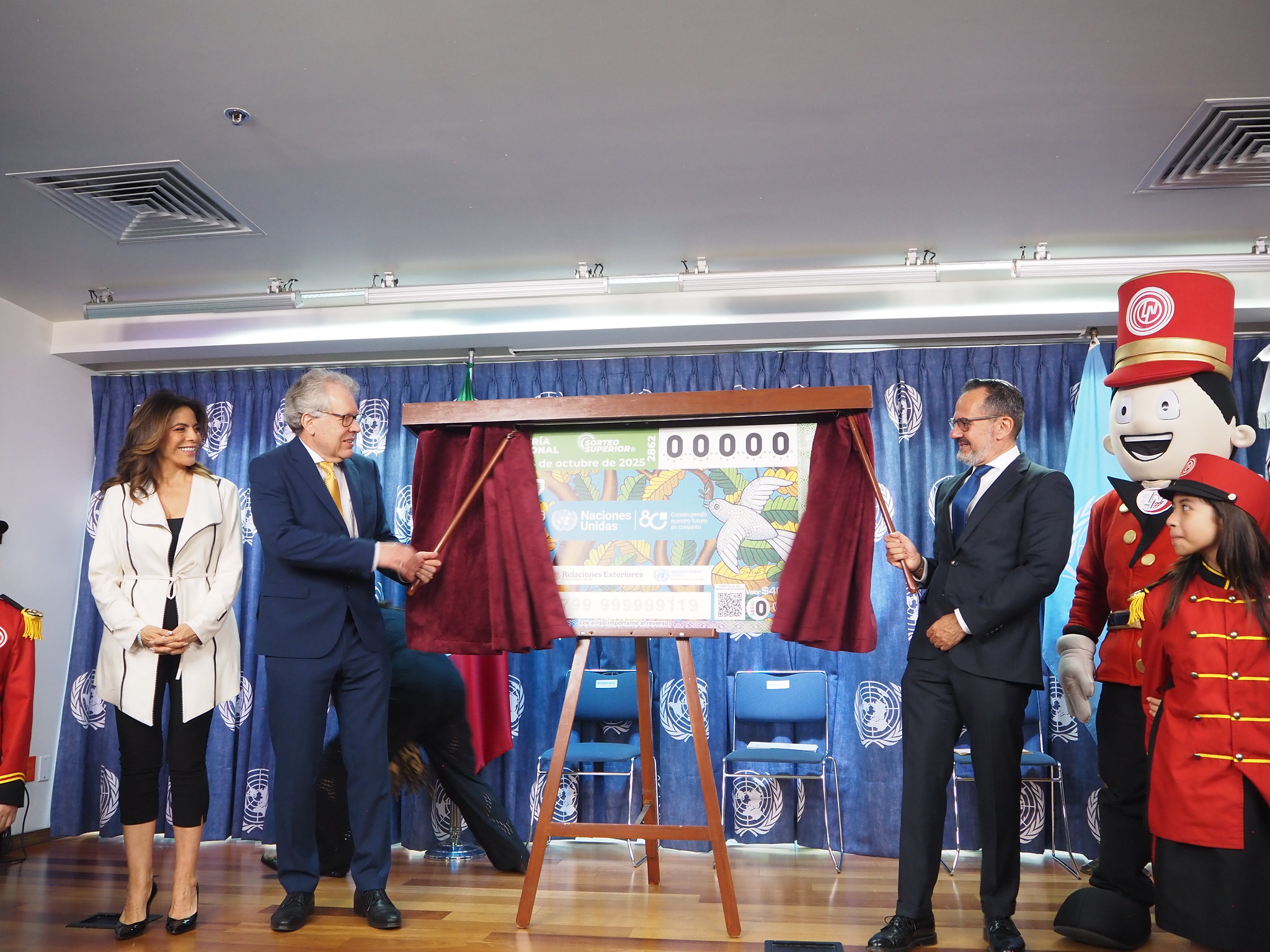En la sede de las Naciones Unidas en México, se llevó a cabo este jueves 16 de octubre la ceremonia de develación del billete del Sorteo Superior No. 2862 de la Lotería Nacional, dedicado al 80 aniversario de la Organización de las Naciones Unidas (ONU).