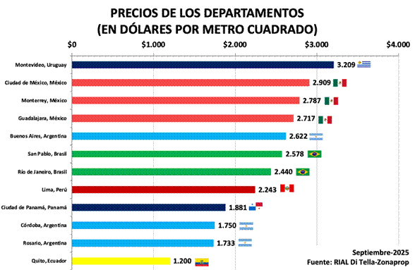 Ciudad de México, 6 de noviembre de 2025. El Centro de Investigación en Finanzas (CIF) de la Escuela de Negocios de la Universidad Torcuato Di Tella en conjunto con Inmuebles24 presentan los resultados del Relevamiento Inmobiliario de América Latina (RIAL Di Tella – Inmuebles24) con datos de septiembre de 2025. Las ciudades con el metro cuadrado (m2) más caro de la región son: Montevideo ($3,209 dólares), Ciudad de México ($2,909 dólares), Monterrey ($2,787 dólares), Guadalajara ($2,717 dólares) y Buenos Aires ($2,622 dólares).