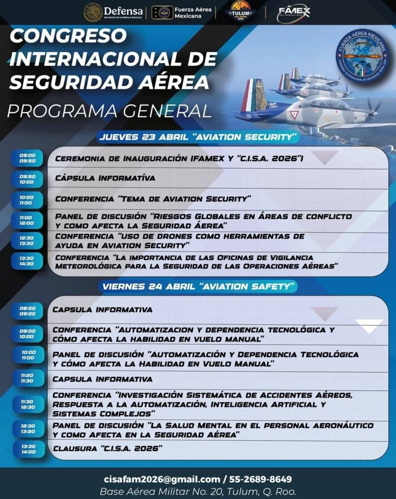 TULUM AIR SHOW 2026 se llevará a cabo en el Aeropuerto Internacional Felipe Carrillo Puerto y la Base Aérea Núm. 20, es impulsado por la SEDENA, FAM, Mundo Maya, MEXICANA y el Gobierno de Quintana Roo. Además del Congreso Internacional de Seguridad Aérea, también se realizará la Conferencia Latinoamericana de Espectáculos Aéreos, con la participación de la Agencia Federal de Aviación Civil (AFAC), quien hará una exposición sobre temas de seguridad.